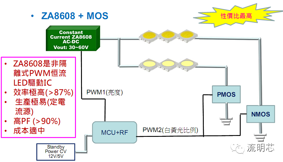 1. ZA8608 非隔离式可变色温/亮度方案, 具备高效率(>87%), 高功因(PF>90), 性价比最高.