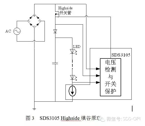 ②Highside开关管是填谷电容的控制开关,SDS3105一方面控制LED灯串恒流驱动,另一方面实时检测LED灯串电压和Highside开关管两端的电压,并控制Highside开关管的开关。